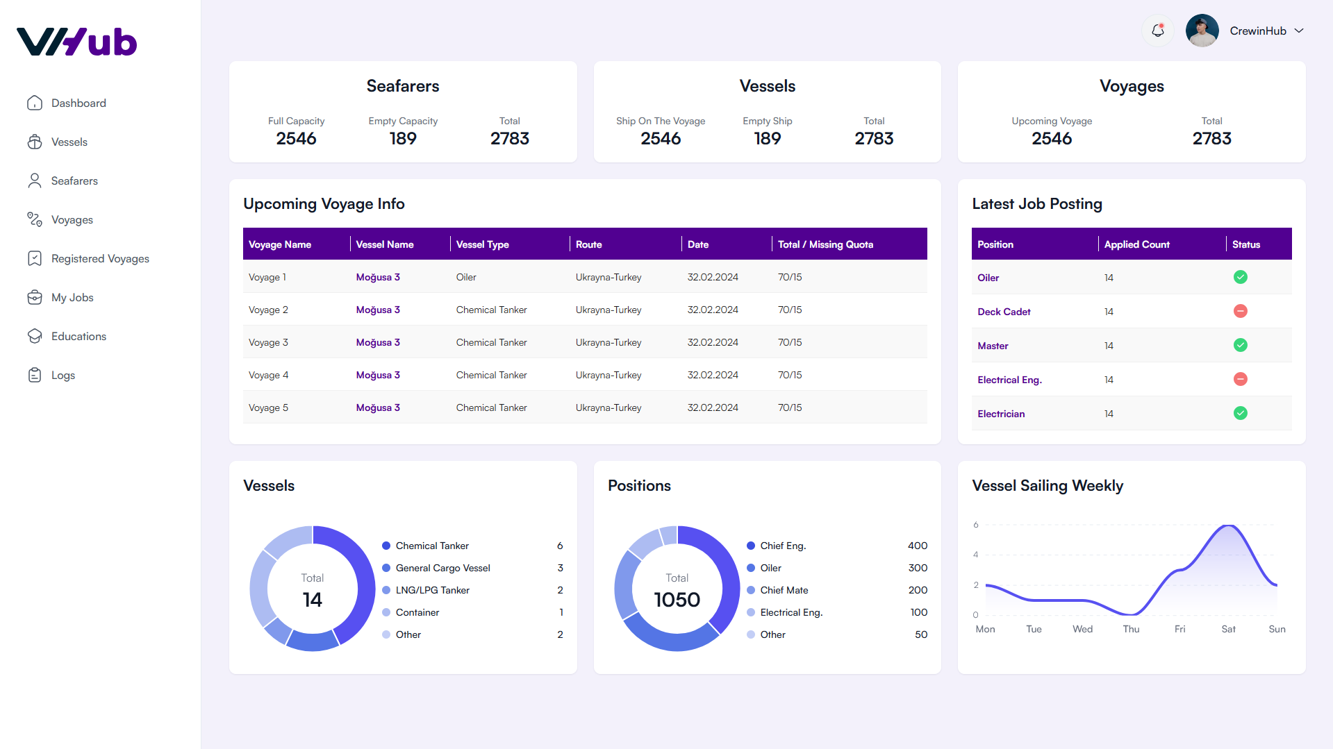 Crewin is a digital platform that manages the full maritime workforce lifecycle—from recruitment to daily crew operations—within a single, integrated system. It covers job postings and candidate matching, crew planning, contracts, documentation, certificate tracking, and compliance, all supported by centralized data and operational dashboards.